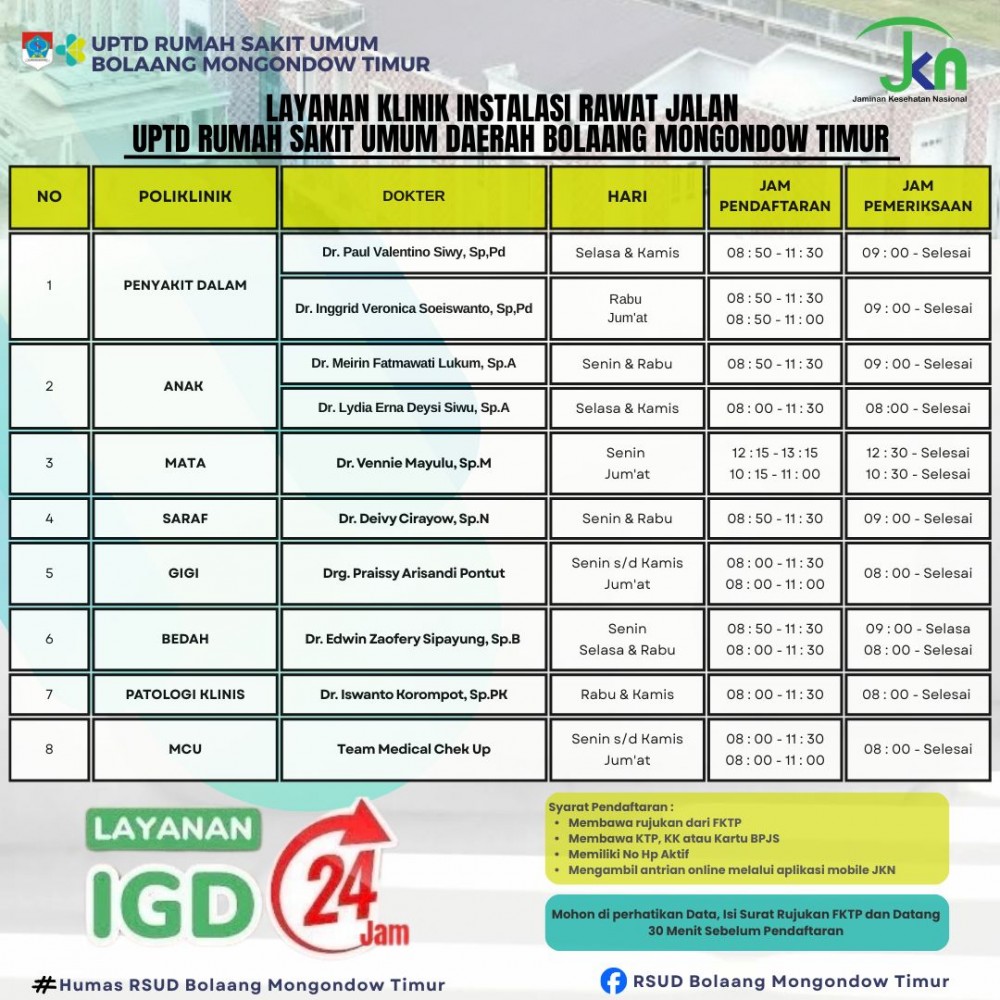 UPDATE JADWAL PELAYAAN POLI KLINIK RSUD BOLAANG MONGONDOW TIMUR.